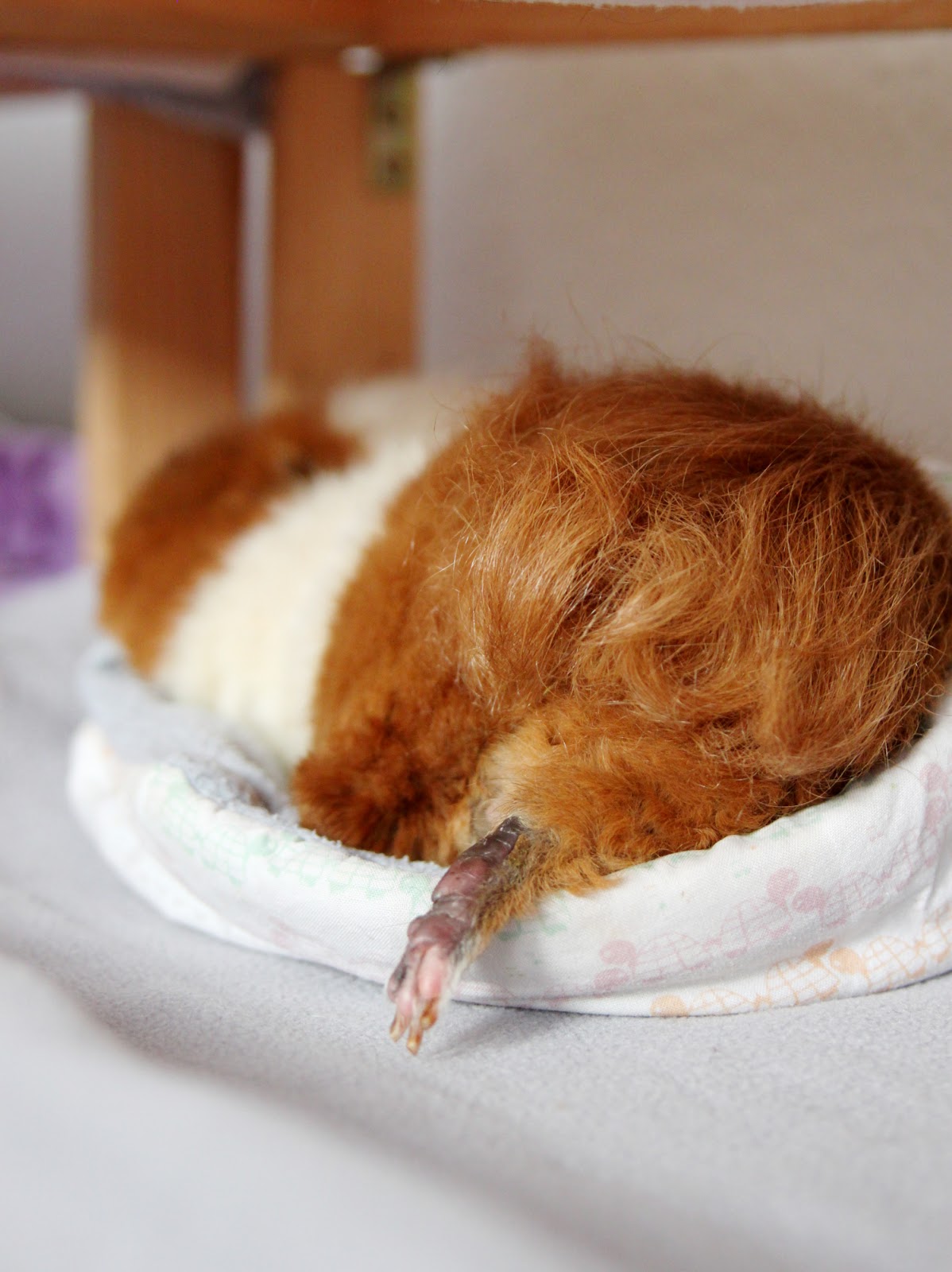 Nur ab und zu zwickt sie böse an unseren Krallen rum und reinigt meine Ohren und meine Schweinemännchendufttasche am Po. Das ist schrecklich und anschliessend bin ich immer sehr beleidigt. Sie macht es aber mit Leckerli wieder gut.